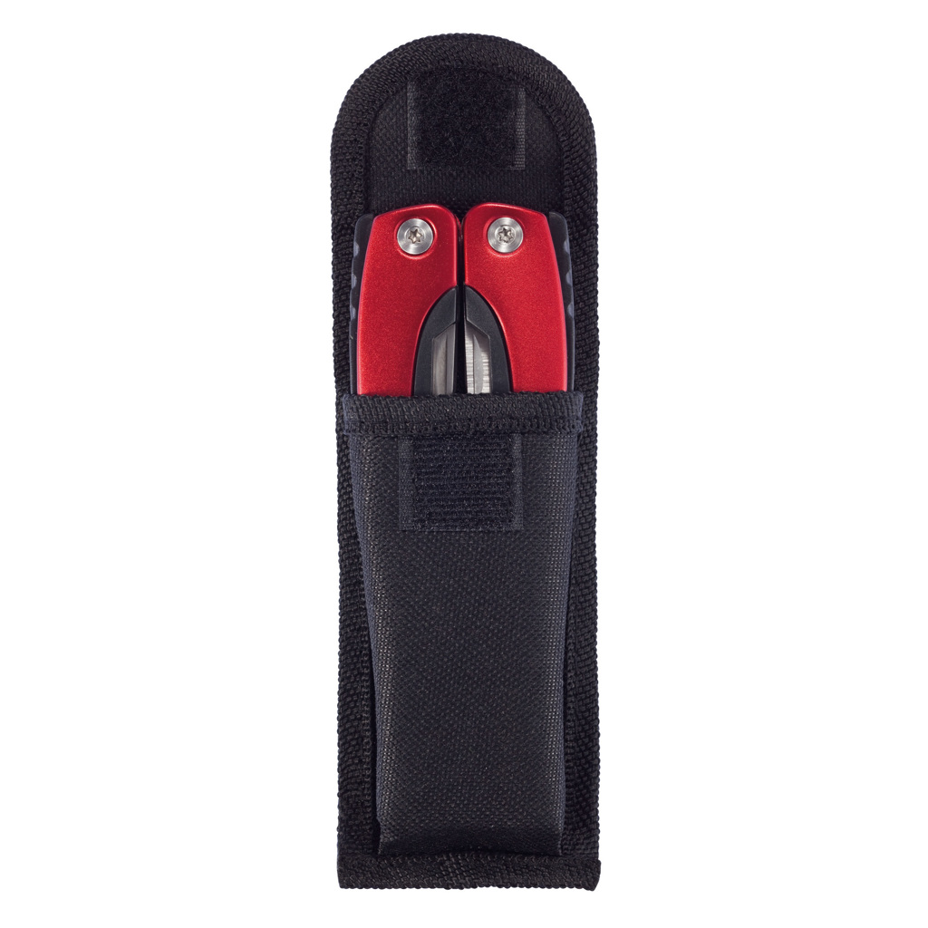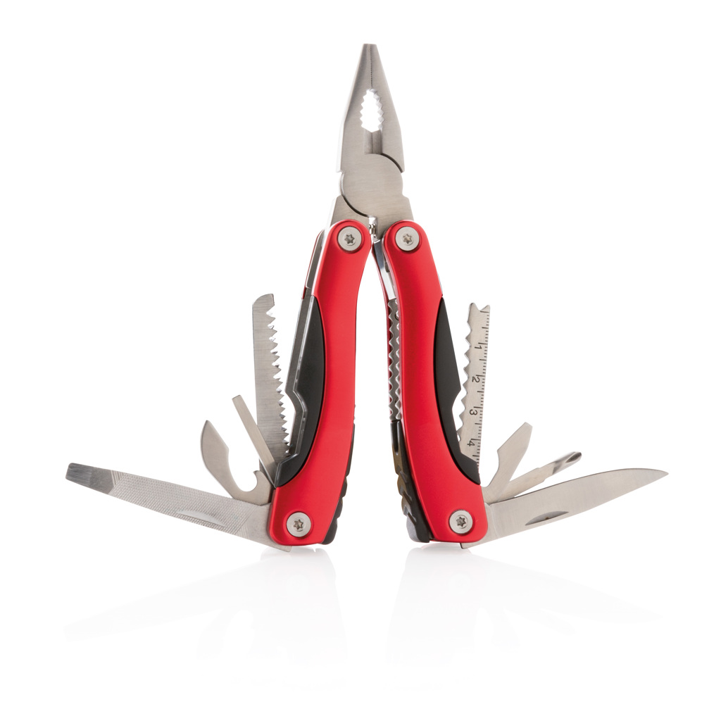 Pince multifonctions en aluminium, manche avec éléments noirs, 14 fonctions. Les outils en acier inoxydable sont: pince à bec, pince, pince coupante, couteau, tournevis cruciforme, décapsuleur, écailleur à poisson, ouvre-boîte, petit tournevis plat, moyen tournevis plat, grand tournevis plat, lime, excavateur à ongles, arrache-clous. Livrée dans une pochette 600D noire.